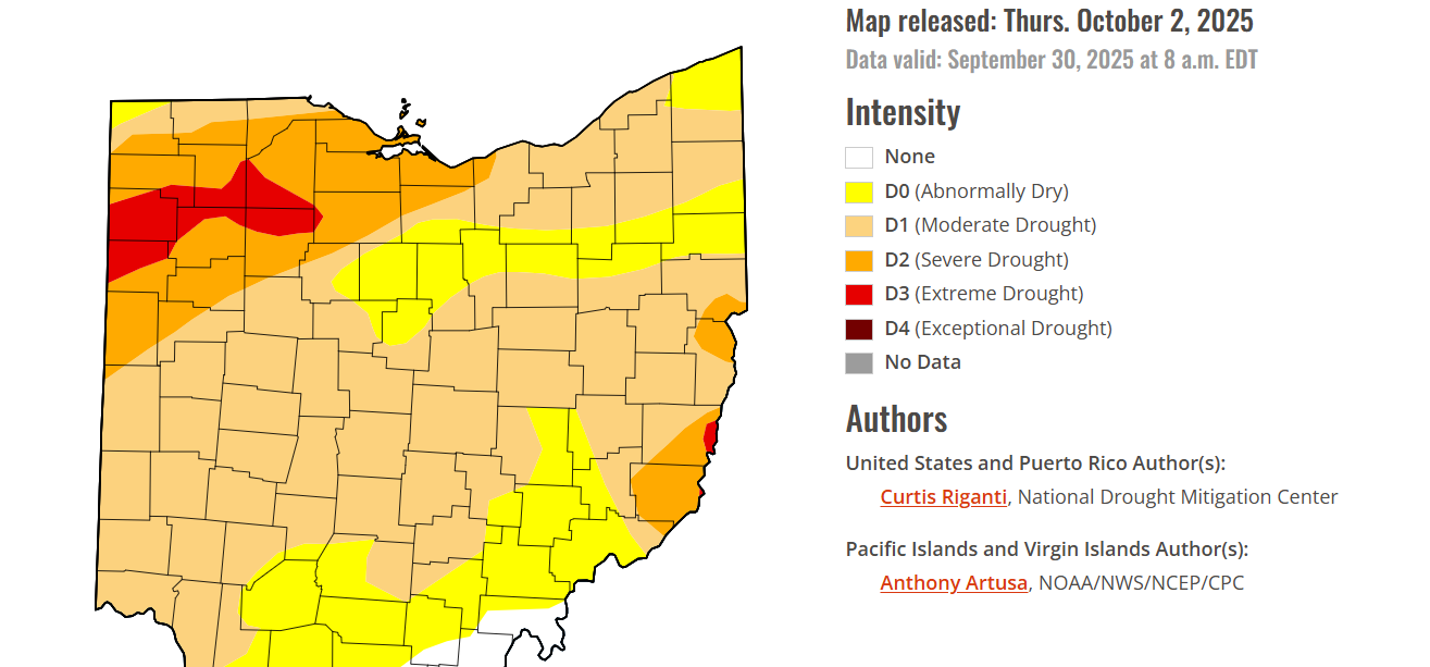 The Extreme Drought designation also extends up into Wood County and over into parts of Putnam and Henry Counties and even further west.