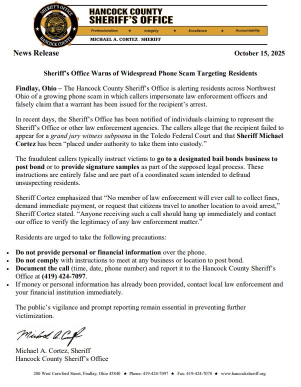 The Hancock County Sheriff’s Office is alerting residents across northwest Ohio about a widespread phone scam in which callers are impersonating law enforcement officers.
