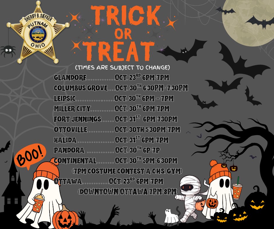 The sheriff’s office released a list of Putnam County community Trick-or-Treat dates and times.