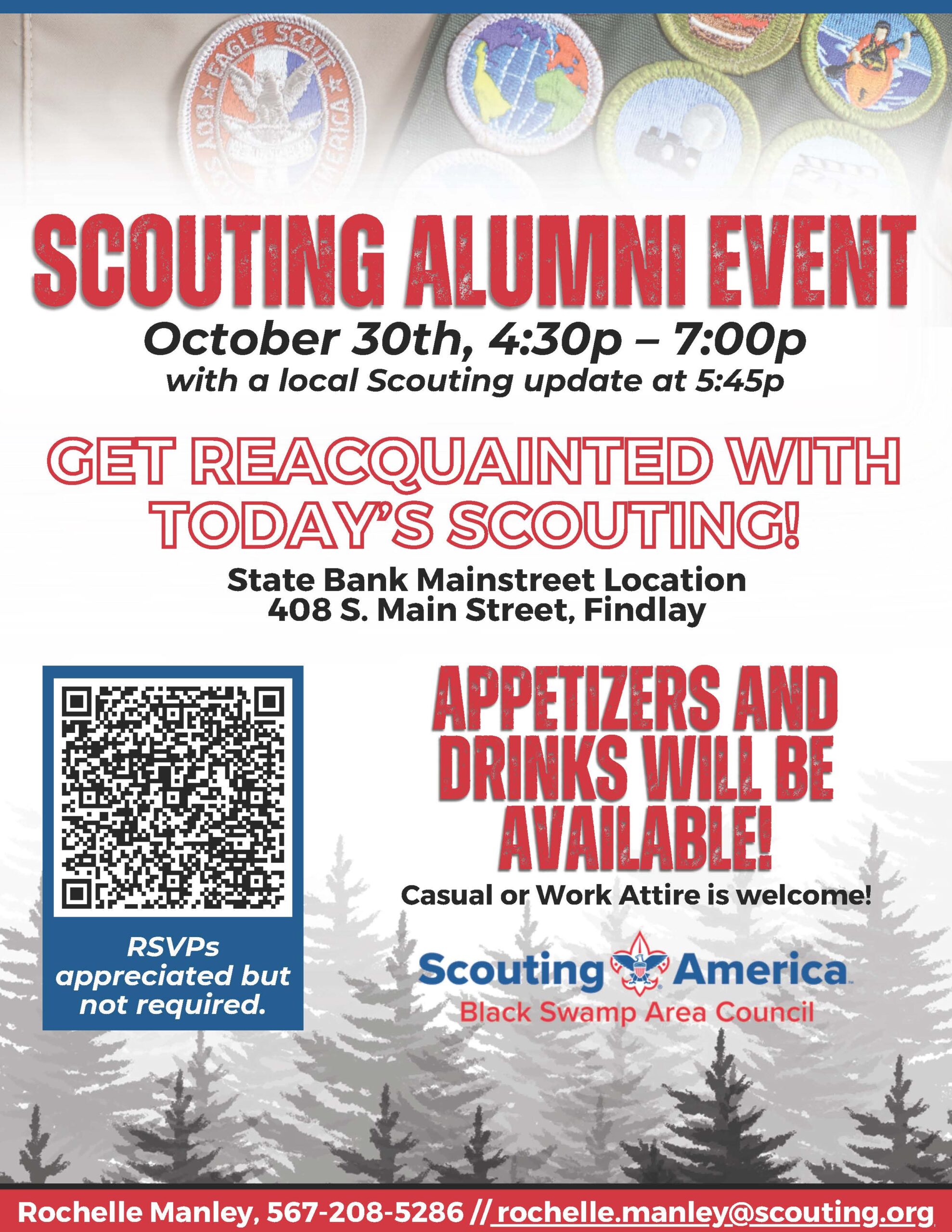 The Black Swamp Area Council of Scouting America invites all Scouting alumni and friends to a special evening of reconnection and camaraderie at the Arrowwood Alumni Event, taking place on Thursday, October 30, from 4:30 PM to 7:00 PM at the State Bank Main Street Location, 408 S. Main Street, Findlay.