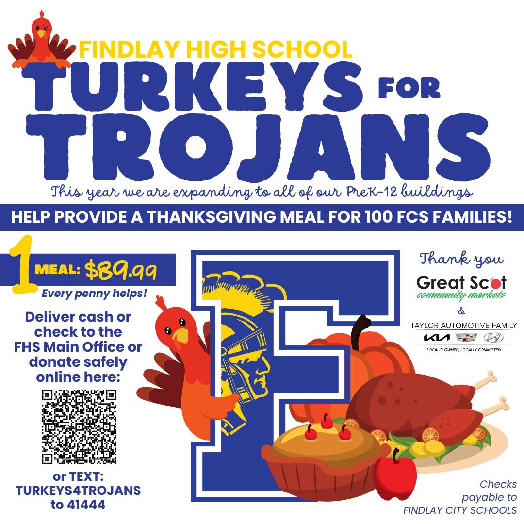 It’s easy to help! You can turn in cash or a check to Mrs. Franks in the FHS Main Office, payable to Findlay City Schools, donate online at fcs.org, or text TURKEYS4TROJANS to 41444.