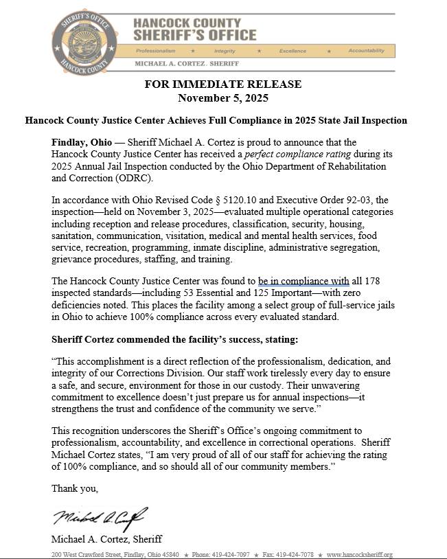 Hancock County Sheriff Michael Cortez has announced that the Hancock County Justice Center received a perfect compliance rating during its 2025 Annual Jail Inspection performed by the Ohio Department of Rehabilitation and Correction.