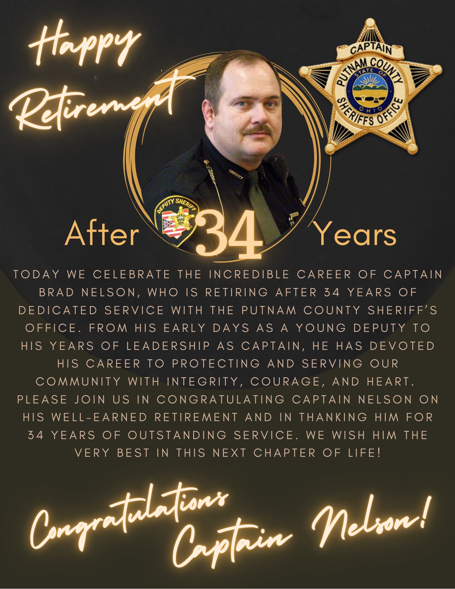 Today we celebrate the incredible career of Captain Brad Nelson, who is retiring after 34 years of dedicated service with the Putnam County Sheriff’s Office.