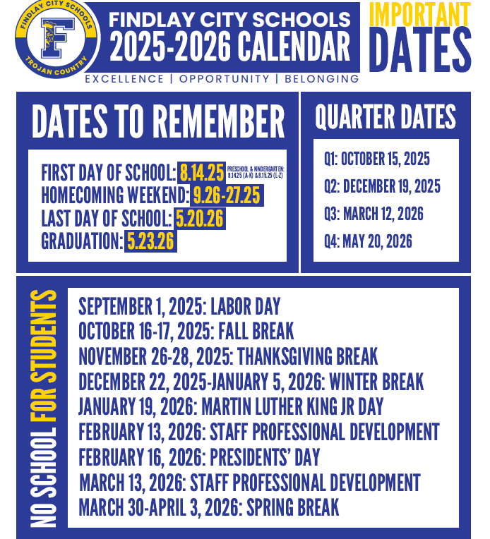 The Findlay City Schools district calendar shows its Winter Break will go from Monday, December 22 through Monday, January 5.