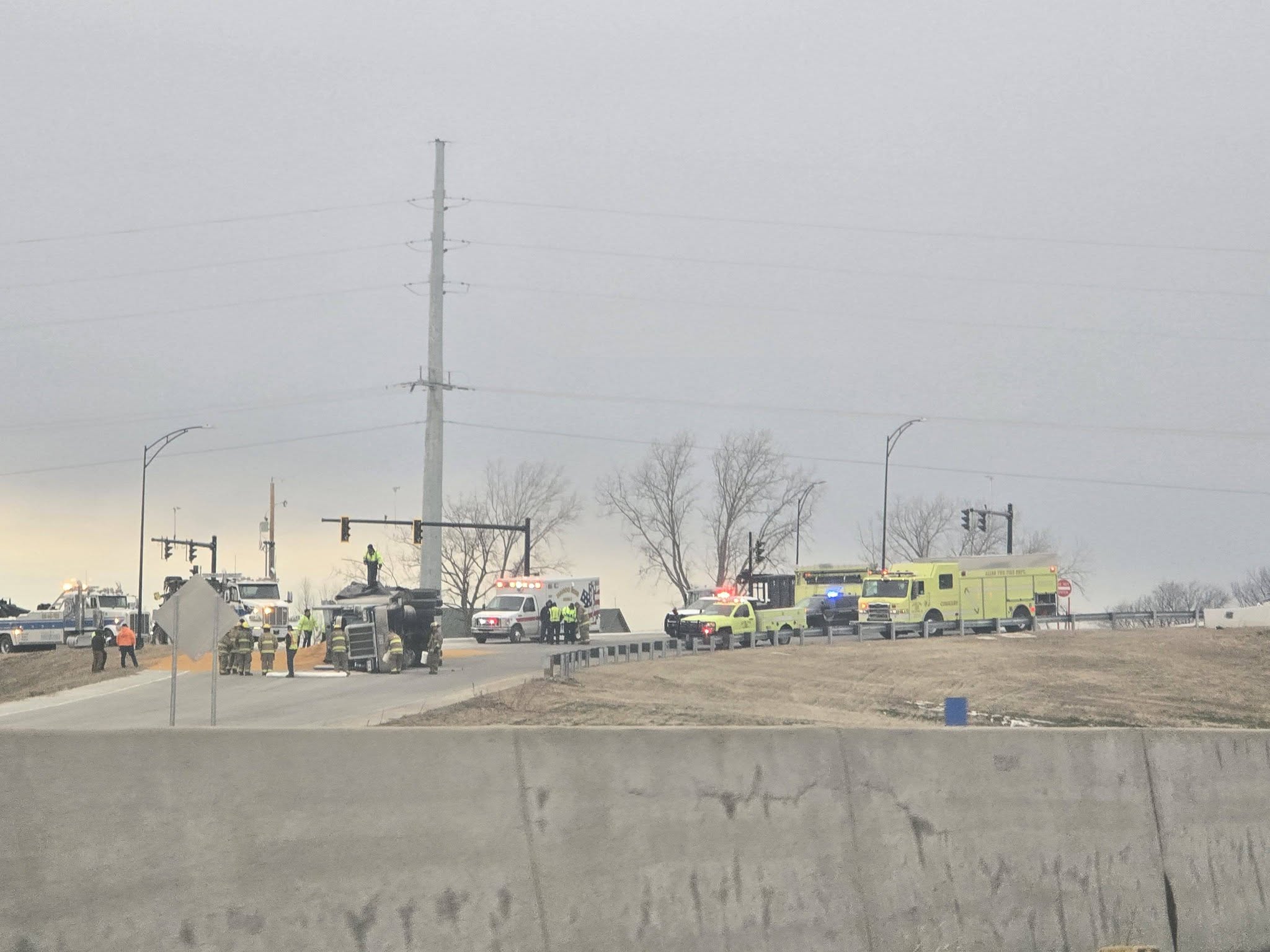 The ramp was closed for a few hours as the semi was towed and the cornmeal cleaned up.